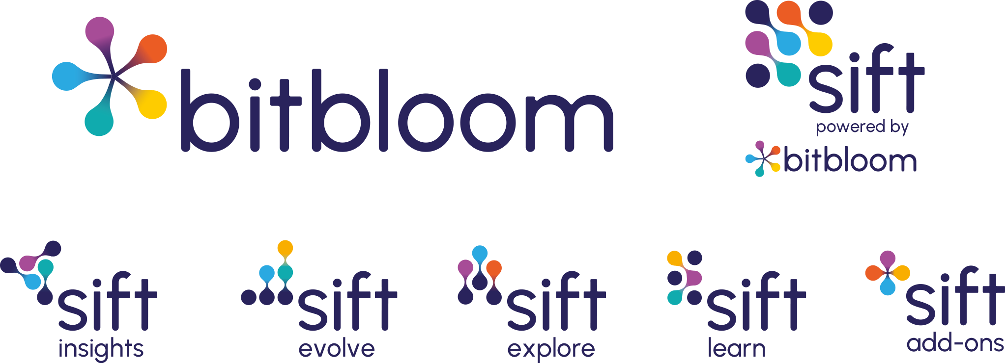 The primary Bitbloom logo effectively symbolizes wind and sun-rays with a distinctive five-pronged mark. Additionally, a vibrant and engaging series of Sift Product Marks underscores the sophisticated capabilities of the software, delving into themes of data exploration and manipulation. This initiative encompasses product identity design, as well as packaging design and production.