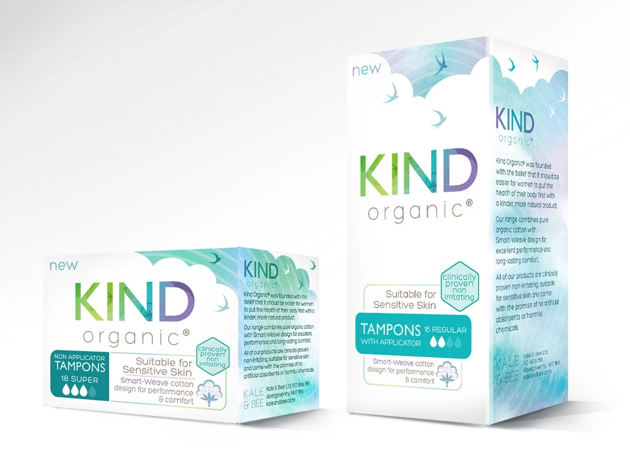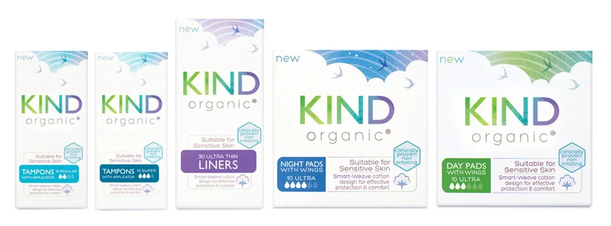 Kind Organic was launched onto the market in a time when sanitary wear filled with chemicals were the norm and orangic sanitary wera was definitely seen as a hippy niche. Kind established a new more mainstraem appeal for a healthier alternative as well as educating the market on the now obvious benefits. Launched on a tight marketing budget, the packaging design communicated the key functional and emotional benefits of the brand and product. These were then promoted using a pack oriented range of key visuals.
